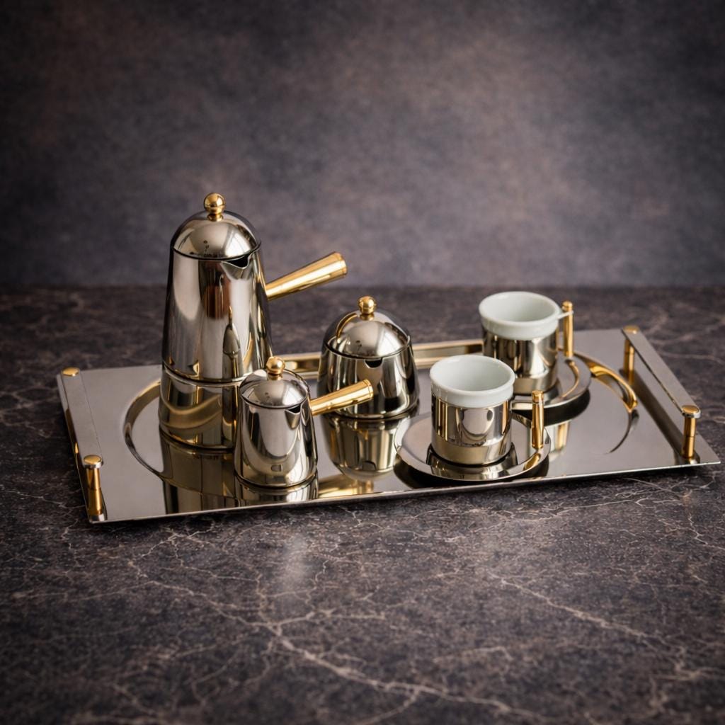 Object: Carmencita Coffee Set – Gold Series Brand: Lavazza Designer: Marco Zanuso Year: 1970s Material: Stainless Steel with Gold-Colored Profiles