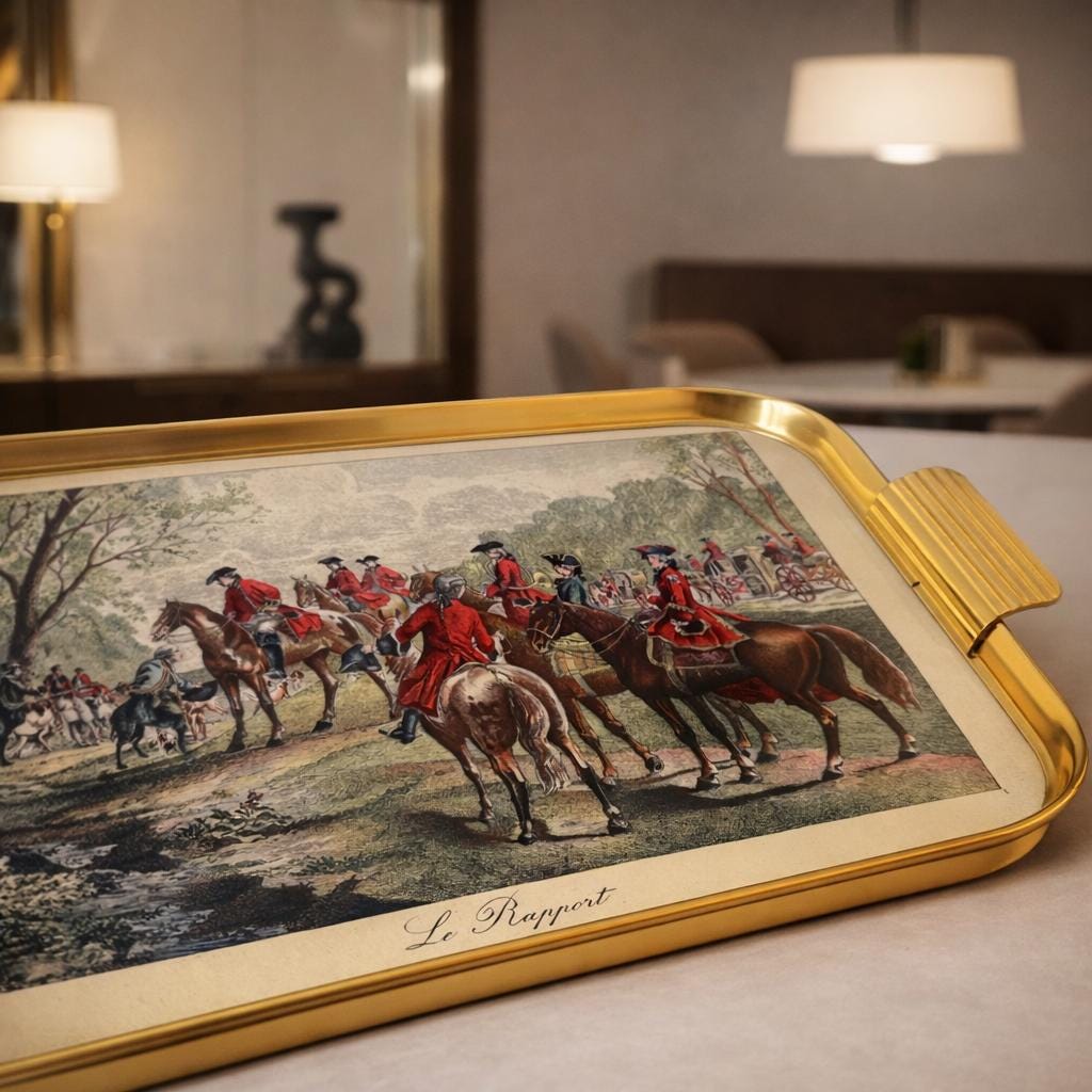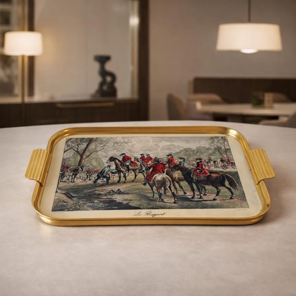 Object: Decorative Serving Tray – Fox Hunting Scene “Le Rapport” Artist reference: After Henry Alken Production: Vintage decorative object Year: circa 1950s–1970s