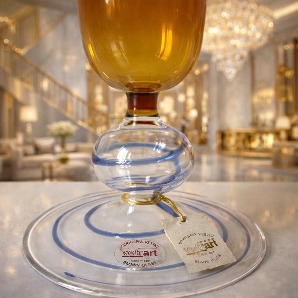 Description Elegant vintage trumpet-shaped goblet produced in Murano, Italy by VetrArt, a renowned Murano glass workshop known for traditional hand-blown glass artistry.