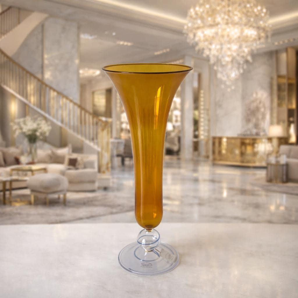 This striking piece features a tall and slender trumpet form crafted in warm amber blown glass, beautifully contrasted by a clear glass stem and foot decorated with subtle blue spiral accents. The elegant proportions and vibrant color make it both a refined decorative object and a fine example of Italian glassmaking tradition.