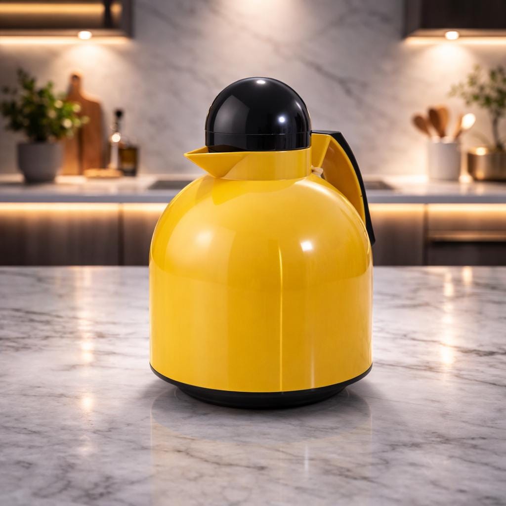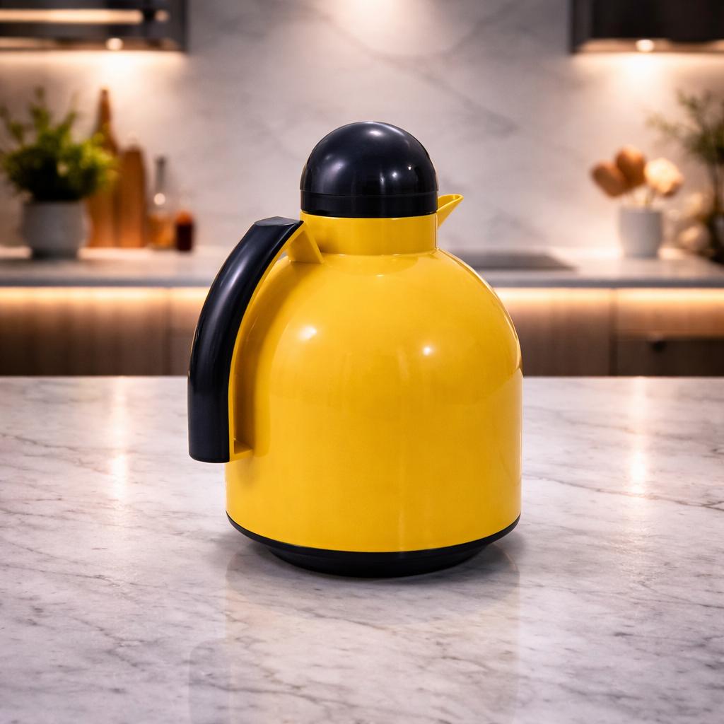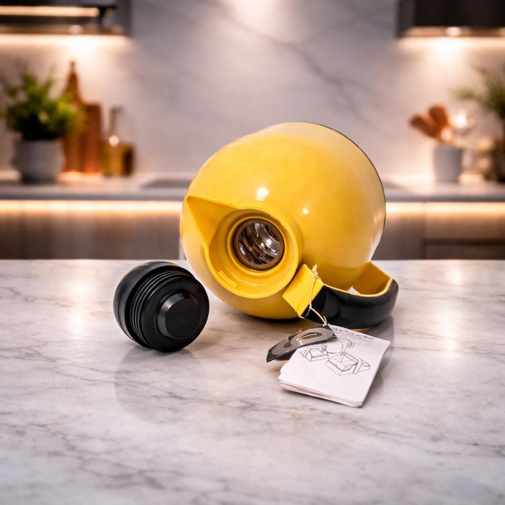 Finished in a vibrant yellow color, this thermos reflects the bold and playful aesthetic typical of Italian design from the late 20th century. Its smooth, rounded shape and ergonomic handle combine practicality with visual appeal, making it both a useful everyday object and a decorative piece.
