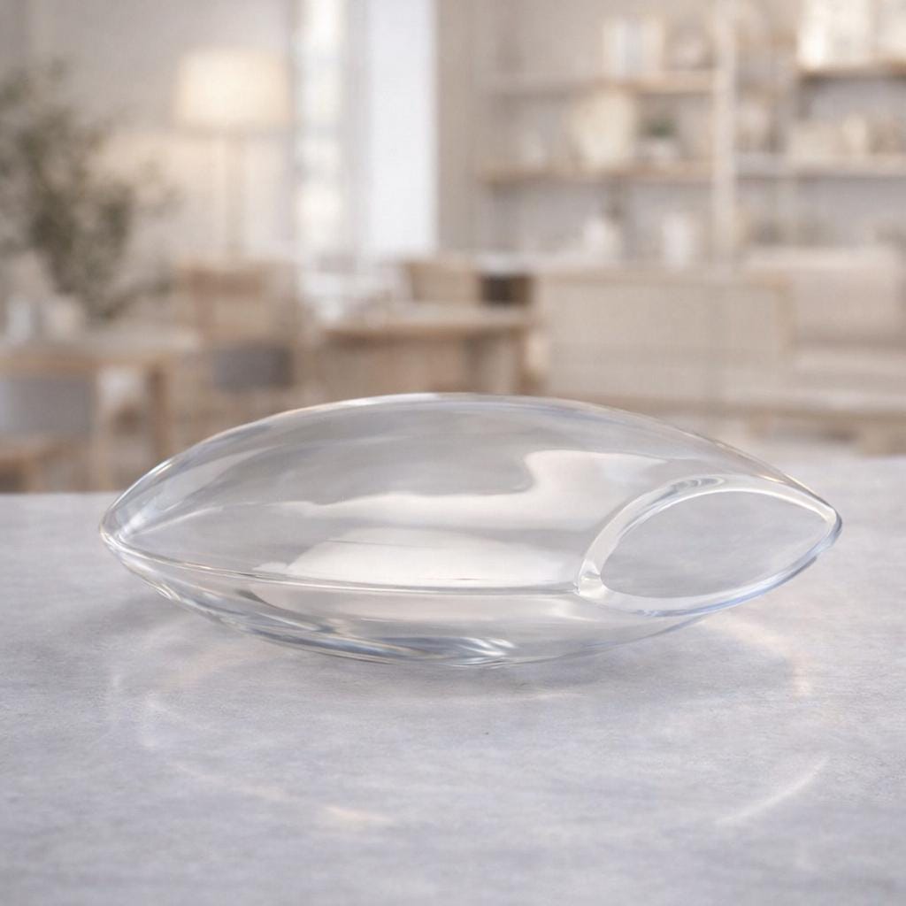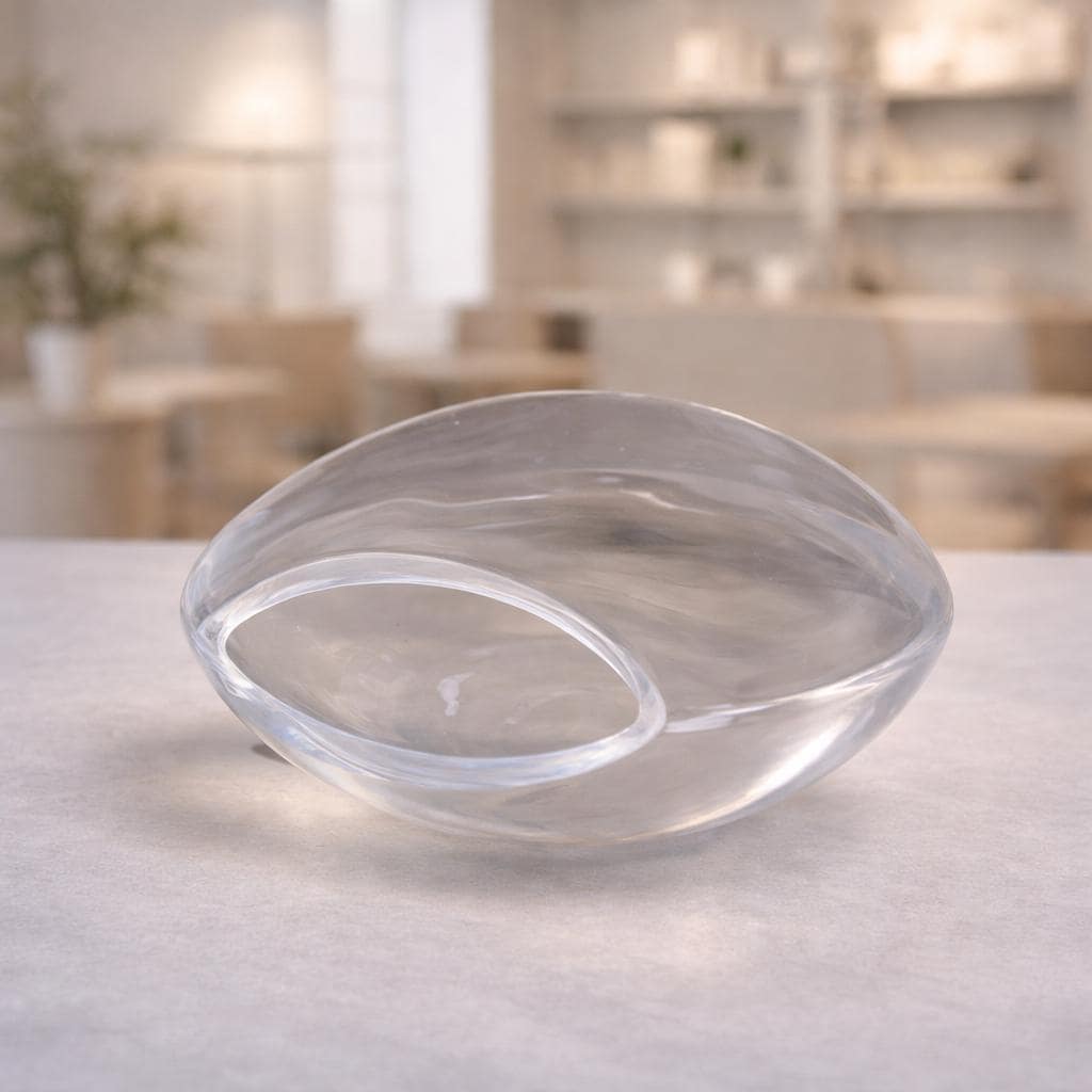 This elegant piece embodies the purity and minimalism of Scandinavian design, featuring a fluid, organic form in transparent glass. The soft contours and subtle play of light within the glass create a calm, almost ethereal presence, making it both a decorative object and a true work of art.